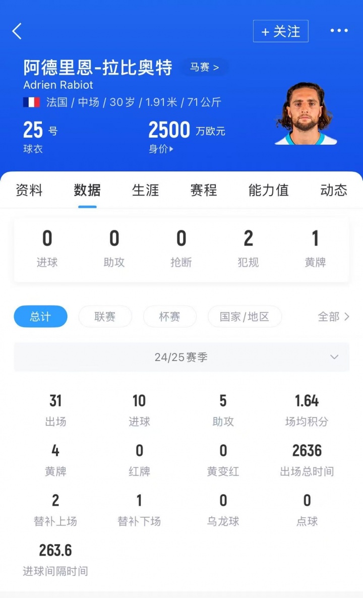 现年30岁的拉比奥特去年免签加盟马赛,上赛季31场比赛中交出10球5助的成绩单,当前德转身价估值2500万欧元。